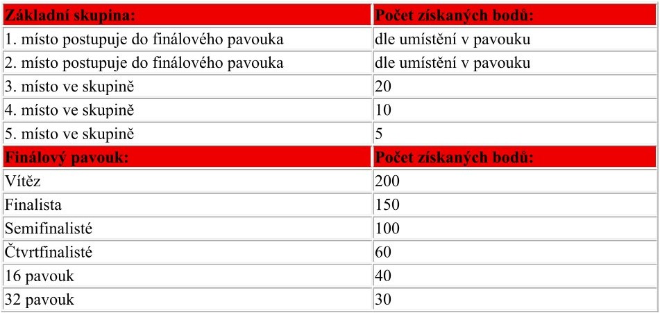 Počet skupin je závislý na počtu přihlášených. Odvíjí se od čtyřčlenné skupiny, pak doplňujeme pátého hráče od skupiny A atd. Do finálového pavouka postupují dva nejlépe umístění hráči ve skupině. Ti co nepostupují do finálového pavouka, mohou hrát útěchu, musí se však přihlásit. Do útěchy nepřecházejí hráči automaticky. Výsledky z útěchy se nezapočítávají do hodnocení průběžného pořadí. V útěše se nenasazuje, celá se losuje. Turnaj hrají děvčata a chlapci dohromady.